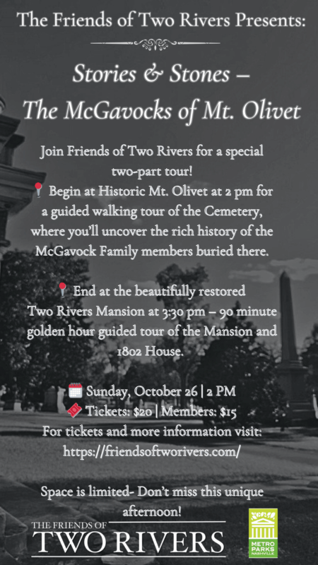 Join us for a special two-part tour! Meet at the main parking lot at Mt Olivet Cemetery (1101 Lebanon Pk, Nashville, TN 37210) at 2pm for a guided walking tour of the Cemetery, where you’ll uncover the rich history of the McGavock family members buried there. Then meet over at Two Rivers Mansion for a golden hour guided tour of the Mansion and 1802 House. $25 for non-members. Friends of Two Rivers Members are $15.