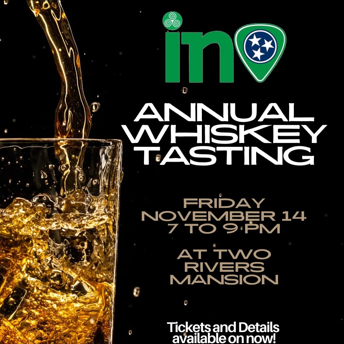 Join the Irish Network Nashville for an exciting evening on Friday, November 14th, from 7-9 pm, at Two Rivers Mansion for the annual Irish Network Nashville Whiskey Tasting! This fundraising event will include live acoustic music from Billy Herring of 1916 Band, guided tastings of classic and rare whiskeys, light bites, and a cash bar hosted by The Lost Paddy!