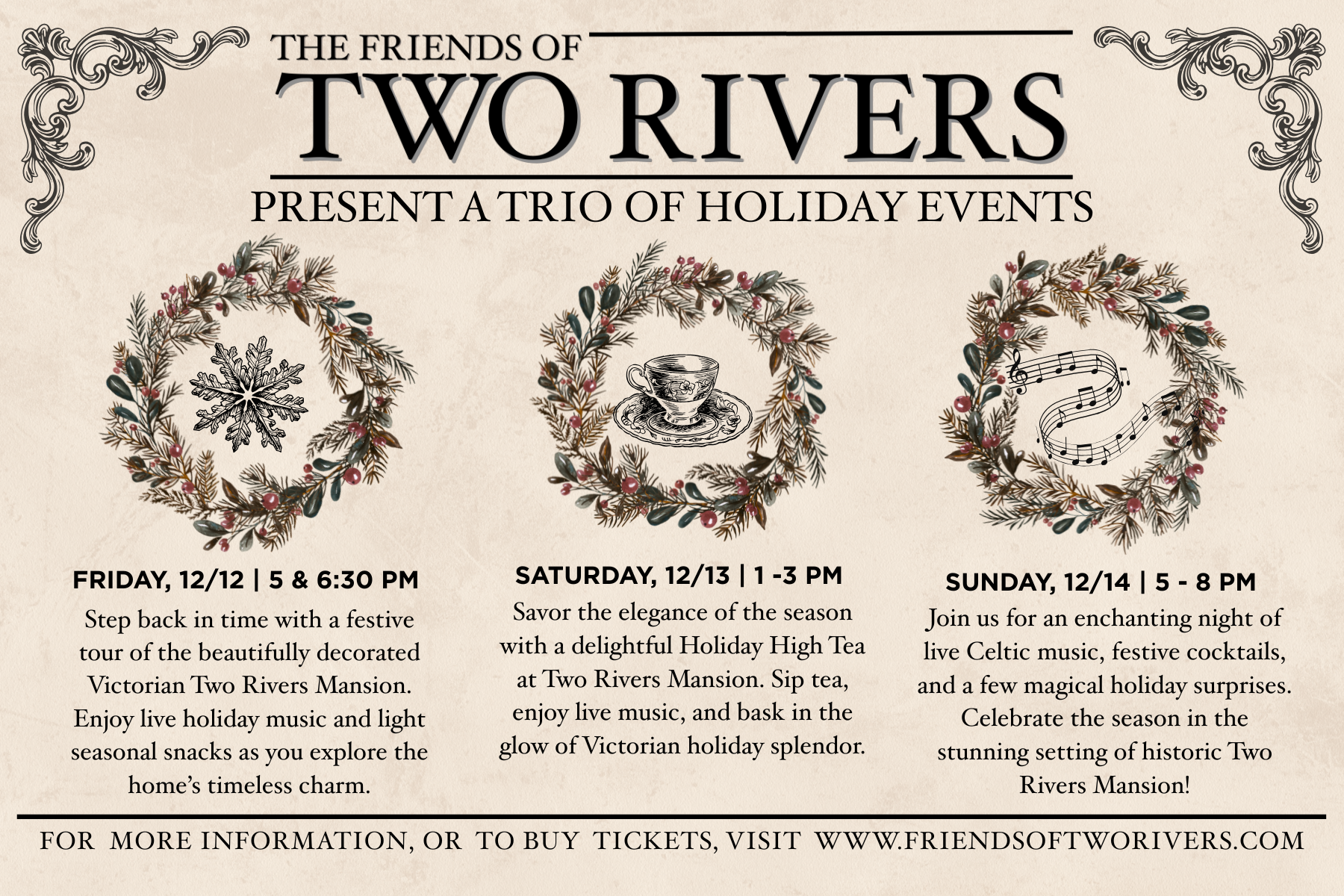 Join us for a Holiday High Tea at Two Rivers Mansion and a special Holiday Weekend of events! On Saturday, December 13, come see the mansion fully decorated and savor the elegance of the season with a delightful Holiday High Tea at Two Rivers Mansion! We will have tea, bites, live Victorian era music, and more…